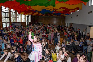 Die Kinder – und auch die Erwachsenen im Saal – hatten ihren Spaß bei Spielen wie der Schwammschlacht, der beliebten Reise nach Jerusalem oder Hula Hoop um die Wette. Für die Sieger gab es kleine Preise oder Süßigkeiten. Bei der riesigen Polonaise, die sich durch den gesamten Saal zog, machten Groß und Klein mit, und beim gemeinsamen Tanzen zum „Fliegerlied“ und „Gute Laune“ war zum Abschluss nochmal jeder gefragt. Das Publikum war auch bei der traditionellen „Stimmungskanone“ gefragt und sorgte für kräftigen Applaus.