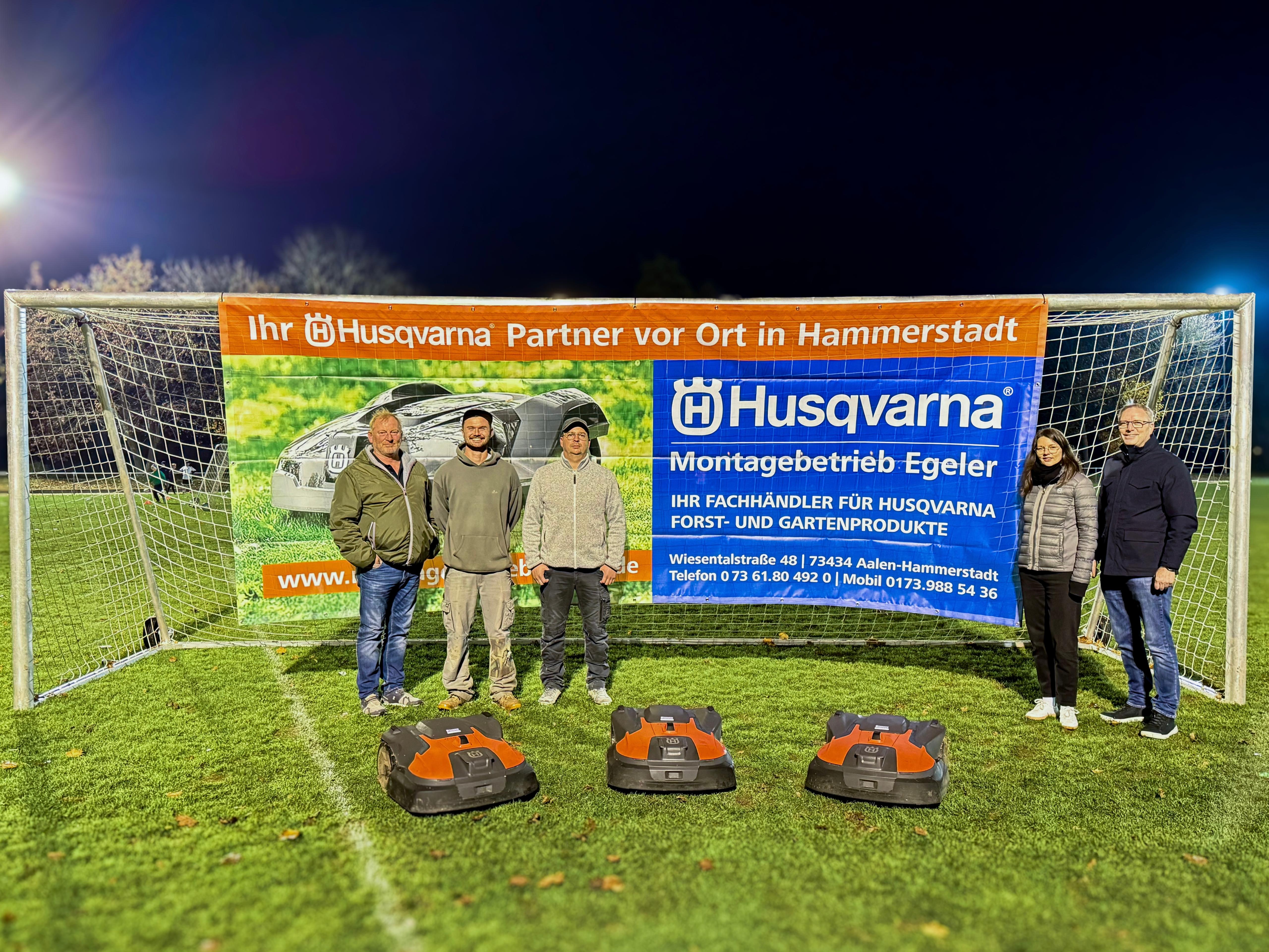 Veröffentlicht am 25.11.2025 in Archiv GesamtvereinBereits seit Sommer sind auf dem Sportplatz Westhausen neue Rasenmähroboter im Einsatz. Bei der kürzlich erfolgten offiziellen Übergabe konnten sich Bürgermeister Markus Knoblauch, Verantwortliche des TSV Westhausen und Bernd Egeler von der Firma Egeler, die die Geräte geliefert und in Betrieb genommen hatte, von ersten zufriedenstellenden Ergebnissen und gepflegtem Grün überzeugen.