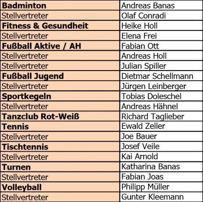 Der Verein besteht aus 10 Abteilungen. Unten finden Sie die Namen der Abteilungsleiter/innen und deren Vertreter/innen.