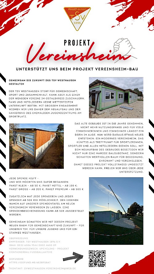 Mit dem Neuaufbau des Gebäudes haben wir nicht nur eine marode Bausubstanz beseitigt, sondern wertvollen Raum für Begegnung, Ehrenamt und Vereinsleben geschaffen. Damit dieses Projekt vollständig umgesetzt werden kann, freuen wir uns über jede Unterstützung. Gemeinsam schaffen wir mit diesem Projekt neuen Raum für Gemeinschaft und Zukunft – für unseren TSV, für unsere Jugend und für ein starkes Westhausen.