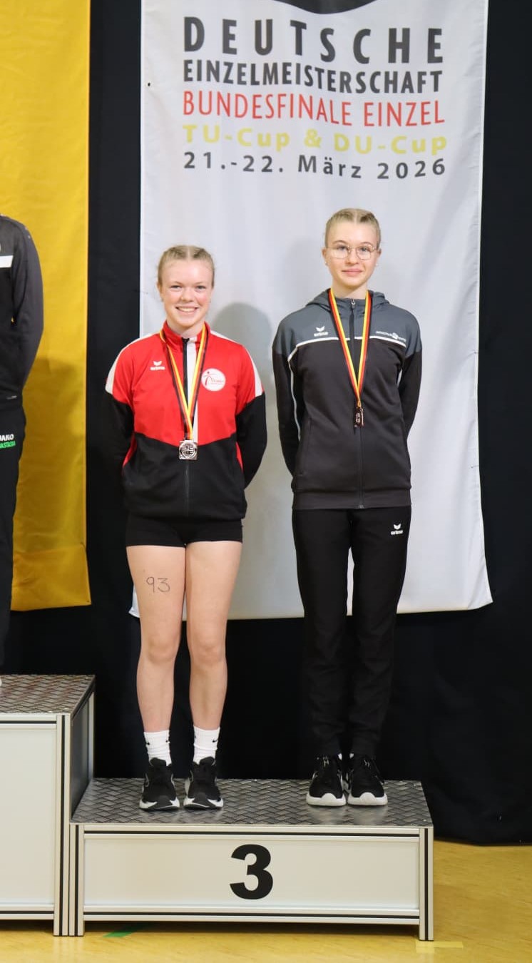 Veröffentlicht am 24.03.2026 in ArchivAm 21./22.03.2026 fand die Deutsche Meisterschaft und das Bundesfinale in Ellwangen statt. Vom TSV ging Marie in Altersklasse 19+ und Anna in Altersklasse 16-18 an den Start. Marie konnte sich bei der Meisterschaft in der Overall-Wertung (3 Disziplinen) eine sehr gute Platzierung im Mittelfeld erspringen. Beim Bundesfinale startete Anna in 2 Einzeldisziplinen und konnte sich bei Single Rope Speed Sprint die Bronzemedaille sichern.