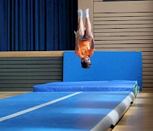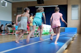 Nicht fehlen durfte natürlich das AirTrack als luftgefüllte Sprungbahn! Hier konnten auch einige Eltern nicht nur zusehend am Rand stehen, sondern haben diese gleich selbst ausprobiert. Und siehe da: Springen, Salto und Co. gehen mit dem AirTrack fast wie von selbst.