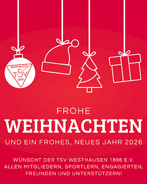 Veröffentlicht am 11.12.2025 in Archiv GesamtvereinDer TSV Westhausen 1896 e.V. blickt wieder auf ein ereignisreiches Sportjahr zurück und es ist Zeit, DANKE zu sagen. Dank Eurer Begeisterung, Eurem unermüdlichen Einsatz und der großartigen Gemeinschaft durfte unser Verein wieder viele schöne Momente erleben – auf dem Platz, in den Hallen und bei unseren Veranstaltungen. Wir wünschen allen aktiven und passiven Mitgliedern, allen Ehrenamtlichen, die unseren Verein durch ihre Treue und Hingabe bereichern, Freunden, Unterstützern sowie der gesamten Gemeinde ein friedvolles und besinnliches Weihnachtsfest.